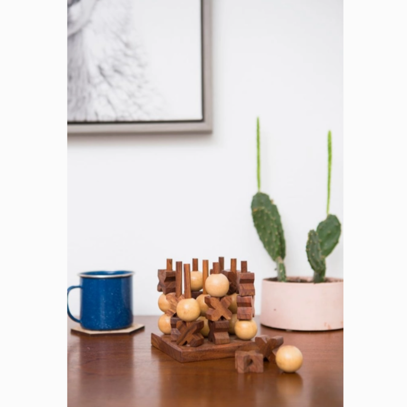 Handcrafted, ethically sourced Indian rosewood and haldu wood tic tac toe game in unique 3D peg design. Please note: This game has small parts. Not suitable for small children.