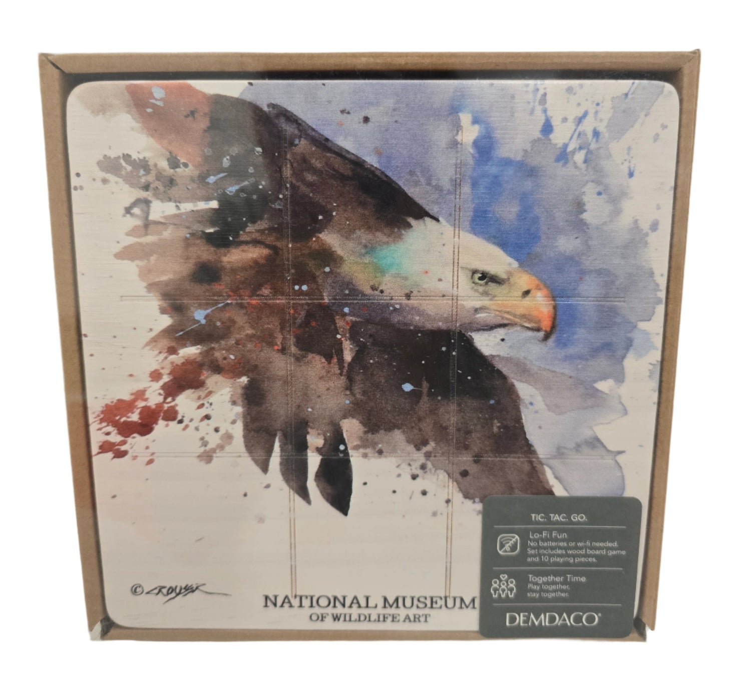 Wooden tic-tac-toe board and game pieces, featuring the National Museum of Wildlife Art name and a beautiful rendering of a Bald Eagle. The perfect gift for a game lover, or the perfect memento for yourself!