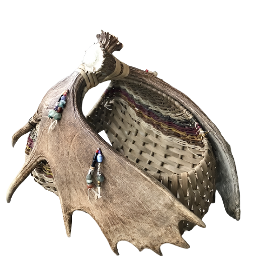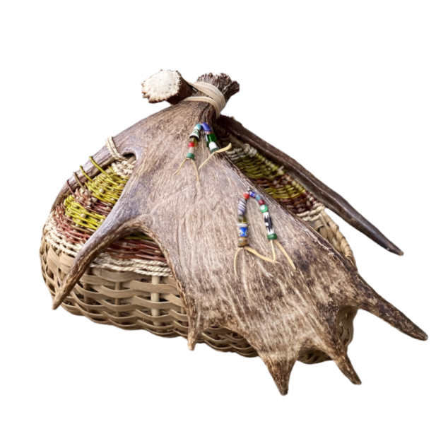 Naturally shed moose antler woven with locally gathered materials and reed.