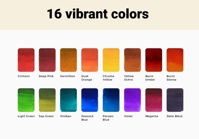 Contains 16 colors: Crimson, Deep pink, Vermillion, Dusk Orange, Chrome Yellow, Yellow Ochre, Burnt Sienna, Burnt Umber, Light Green, Sap Green, Viridian, Peacock Blue, Persian Blue, Violet, Magenta, Slate Black.