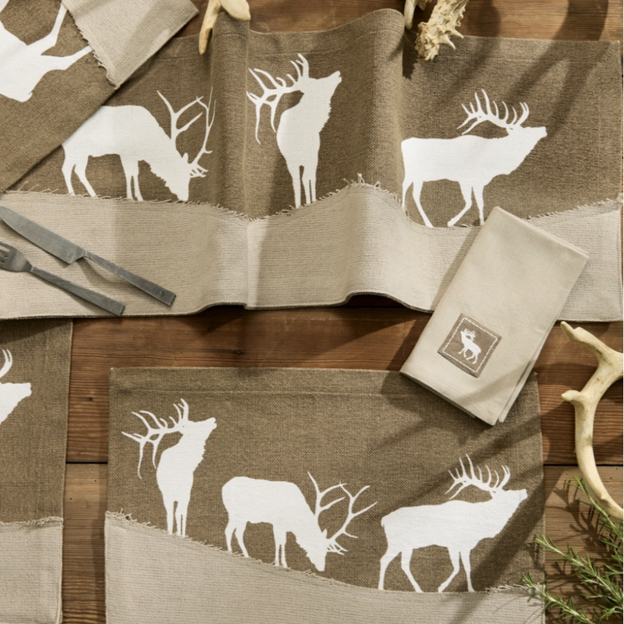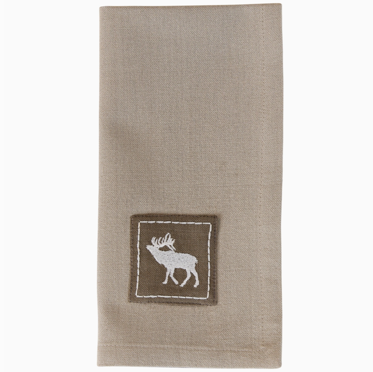 Bring a touch of rustic charm to your dining table with our Elk Lodge Applique Napkin. Crafted from soft taupe-colored cotton fabric, this napkin features a striking applique design: a rich brown background on stone-colored cotton fabric, showcasing a majestic moose silhouette.