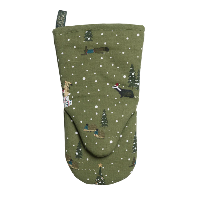 A magical Christmas design celebrating woodland animals in a festive forest, dotted with hedgehogs, badgers, hares and squirrels in a snowy scene on a rich olive ground. This oven mitt is perfect for moving baking trays and pans around the kitchen.