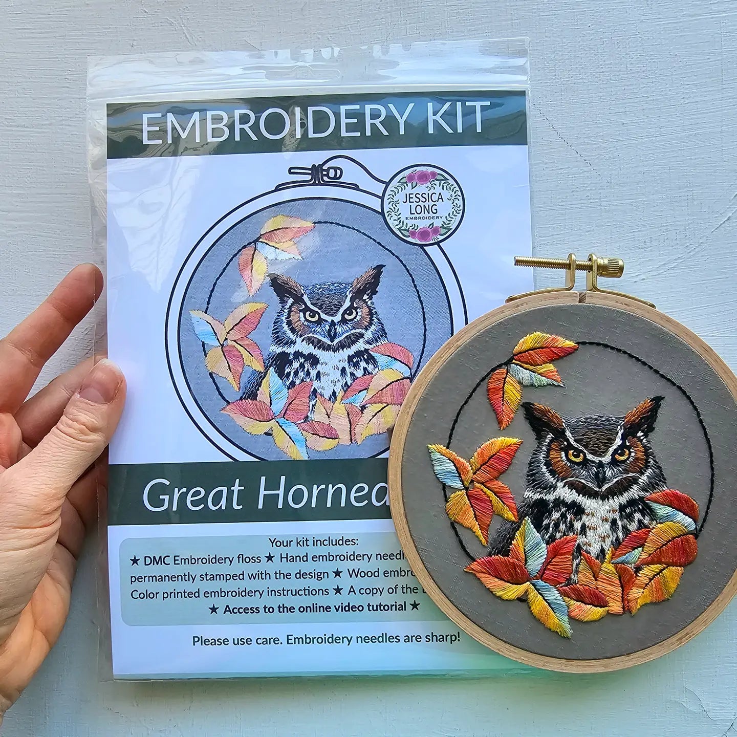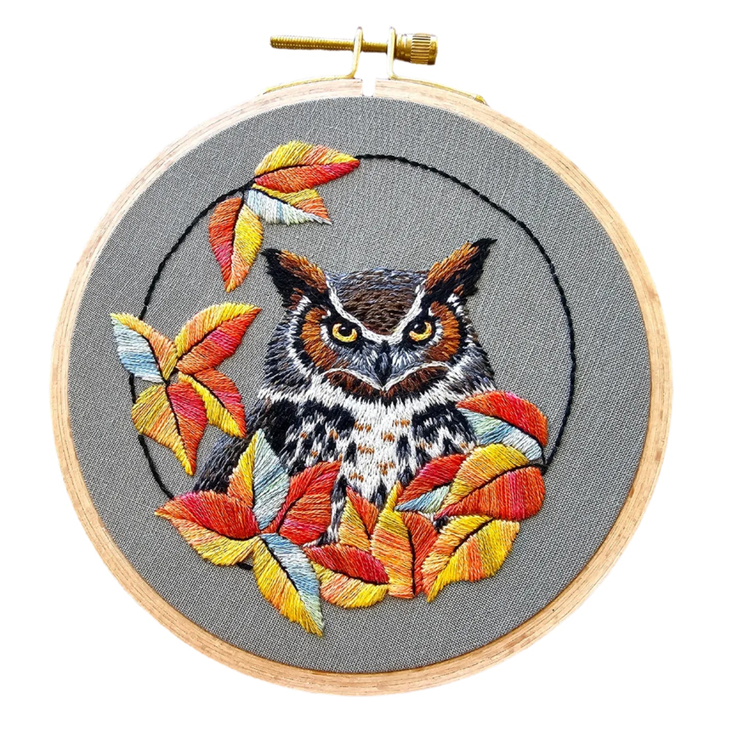 This eye-catching autumnal project combines realistic thread painting with bright, bold satin stitched leaves. Recreate the intricately spotted and striped feathers of the great horned owl using a full palette of colors while following along with an online video tutorial. The kit includes everything you need to complete the project, from detailed instructions and diagrams quality stitching supplies.