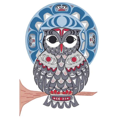 Owl magnet by artist Angela Kimble. Her cultural background is Coast Salish. The artist is paid a royalty on every sale.