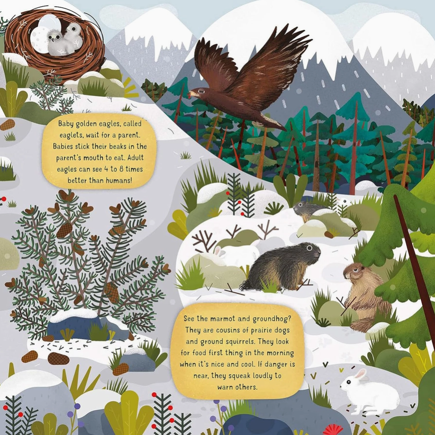 This vibrant children’s book is a one-of-a-kind adventure to see what life is like on a mountain range through all the seasons! From which animals turn white when it snows to who is the best ice and rock climber, which baby animal endures a harsh early life, and so much more, young readers will learn all about the incredible mountain wildlife!