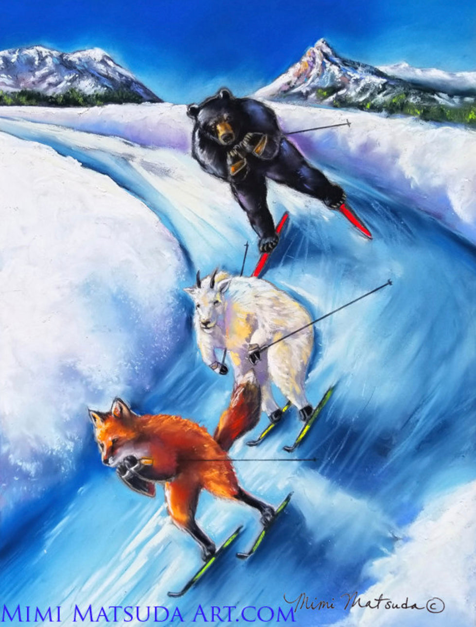 "Outfoxed" is a painting that celebrates the excitement and speed of cross country skiing. This time the red fox takes the lead and outfoxes the black bear and mountain goat. The setting is the Crosscut Mountain Sports Center, in Bozeman, Montana, but, this drama takes place everywhere :)