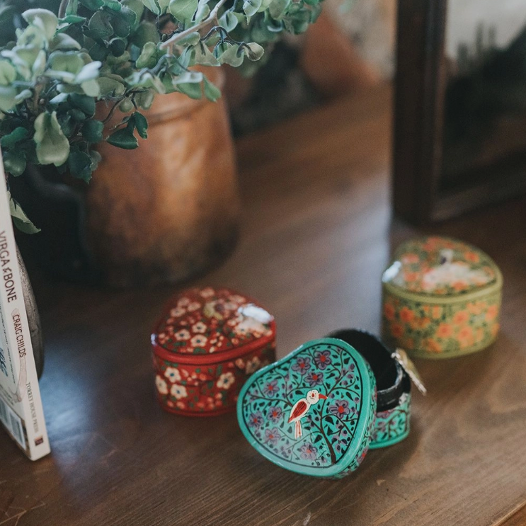 This vibrant set of 6 paper mache, heart shaped boxes are handcrafted in India utilizing traditional papier mache techniques. The process is similar to modern papier mache, incorporating recycled newspaper, cloth, and rice or straw to create the pulp. Once the paste is set and dried, the artwork is created freehand using non-toxic paints and finished with lacquer. This art form has been passed down from generation to generation. Each box will feature an intricate, one-of-a-kind Indian painting of birds and flowers expressed with Indian design aesthetics and motifs. This is lovely gift on its own or to use as a unique gift box for a special occasion. Dimensions:2.5"L x 2.5"W x 1.5"H. All of Matr Boomie's collection is handmade, fair trade and sustainable.