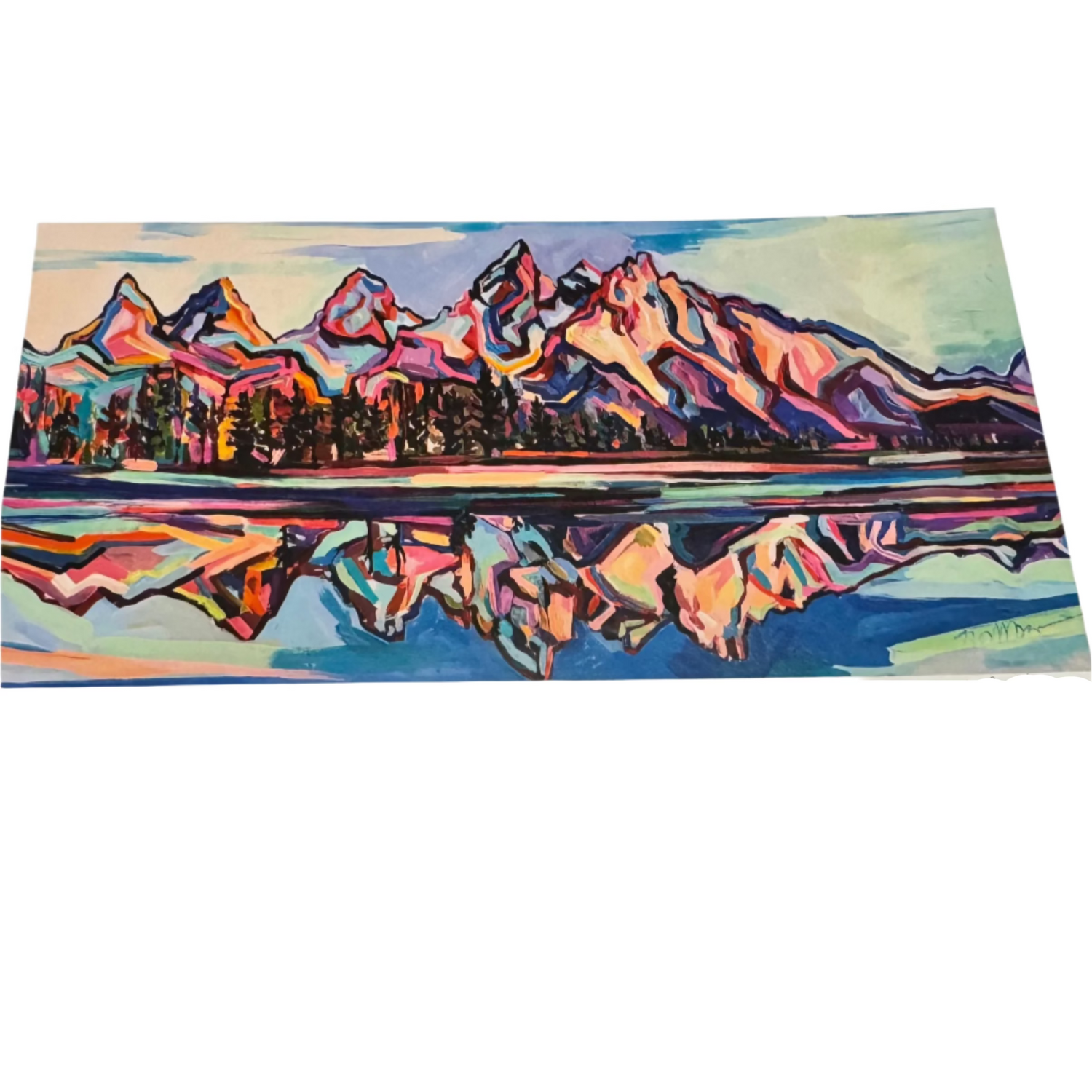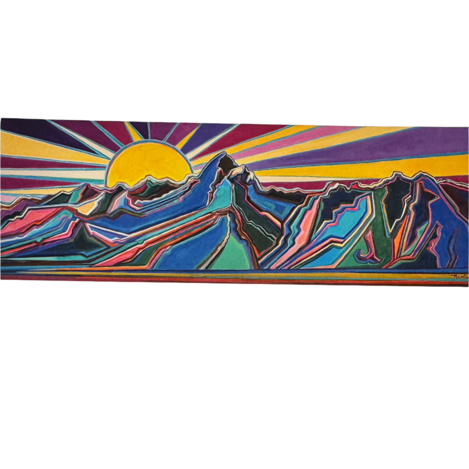 A colorful art piece, by Noelle Weimann, featuring a sun rise over stylized mountains in watercolor.