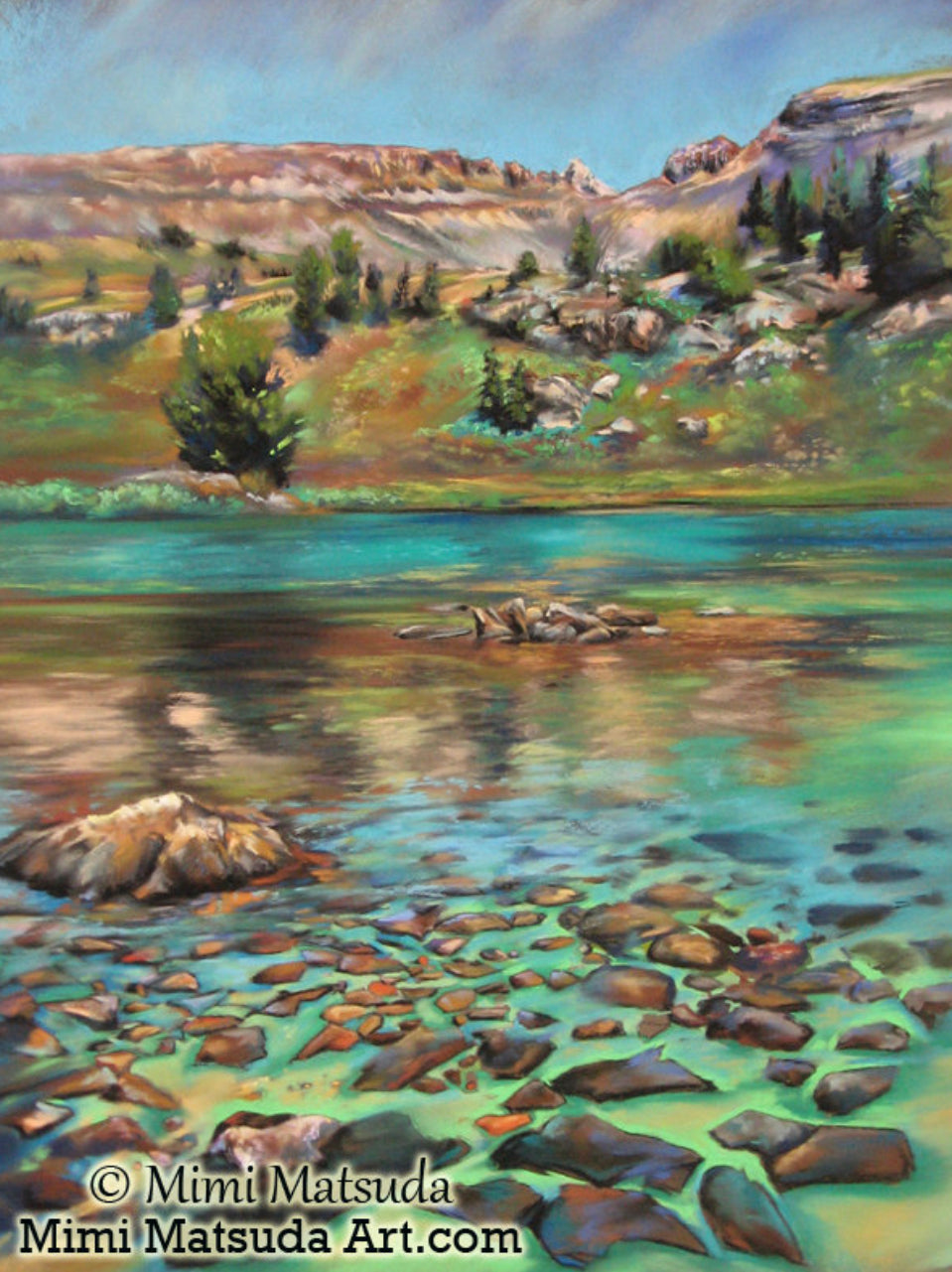 An original soft pastel of the multicolored Sunset Lake, in the Teton Range of the Wyoming/Idaho border. This is one of my favorite places in the world. This art is available in reproduction form. *Original sold. ©Mimi Matsuda