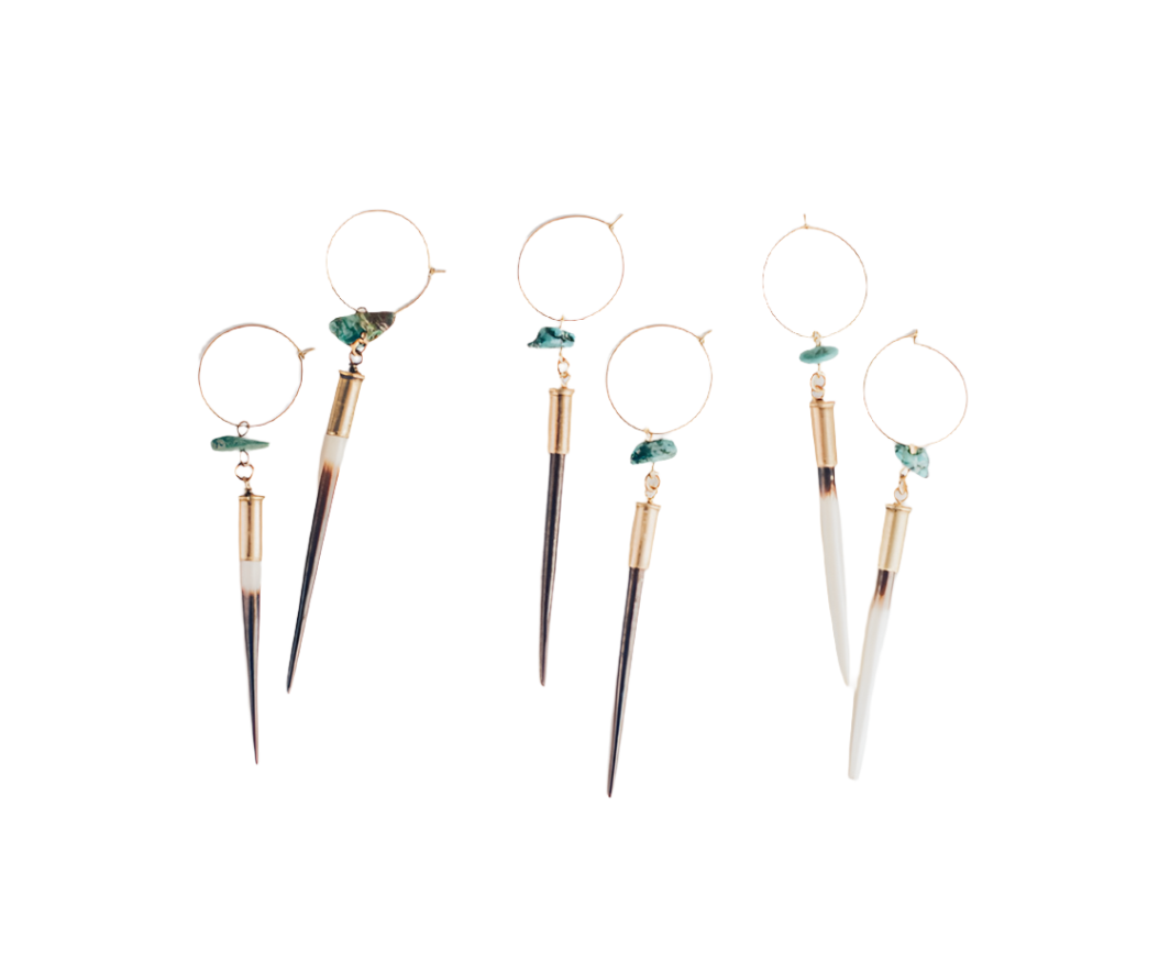 Natural porcupine quills set in .22 bullet casing with American Turquoise on 1" brass hoops. *Quills have been sanded smooth to avoid injury. Quill coloring and length varies (1.5in - 3.5 in). Length is measured from the top of the bullet casing to the bottom of the quill.
