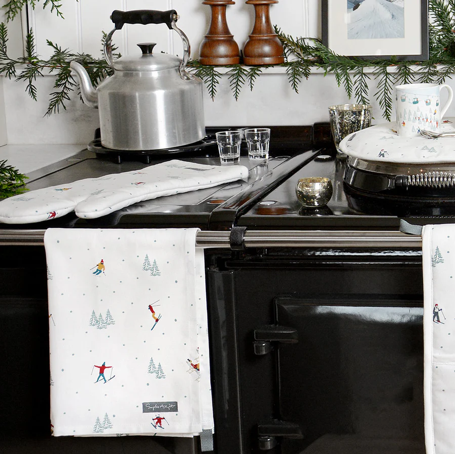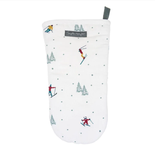 A fun design that celebrates Alpine living, snowboarders and skiers dot the mountain in colorful outfits on this oven mitt. A brilliant kitchen theme for keen skiers!