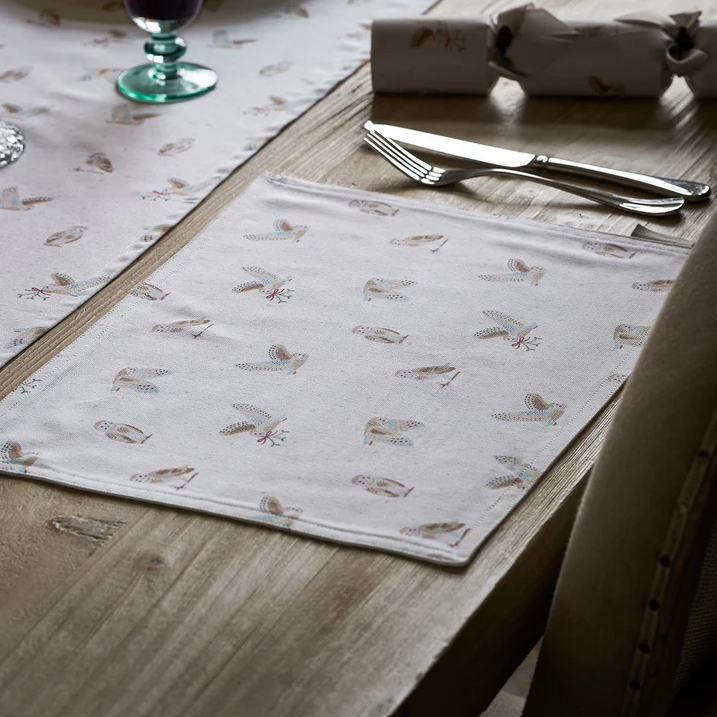Add a festive touch to your table setting this season with these charming cotton placemats, which can be machine-washed and come as a set of two. Sophie's Snowy Owls design is sure to make guests smile, with illustrations of graceful owls soaring through the snowy sky and perching on branches. The occasional owl carries a sprig of mistletoe, lending a charming festive feel. A lovely design that is sweet and sophisticated, offering a neutral white look that coordinates beautifully with many interiors.