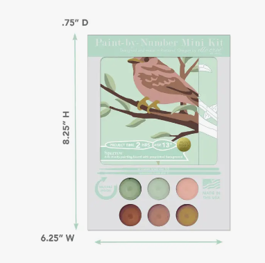 The perfect party activity! “Sparrow” mini paint-by-number kit (6"x6" painting board) depicts this sweet bird in muted pinks and browns perched on a leafy branch. This kit features gold metallic paint! The preprinted background sets this feathered friend against pale blue with a white border. Completing the painting can take between 1-2 hours. Ages 13 and up.