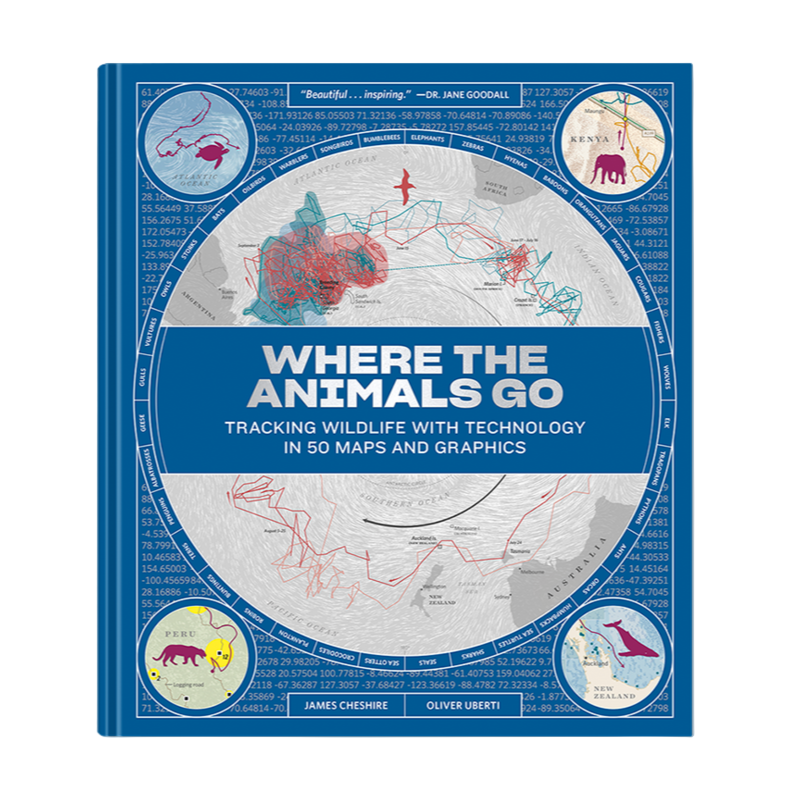 For thousands of years, tracking animals meant following footprints. Now satellites, drones, camera traps, cellphone networks, and accelerometers reveal the natural world as never before. Where the Animals Go is the first book to offer a comprehensive, data-driven portrait of how creatures like ants, otters, owls, turtles, and sharks navigate the world. Based on pioneering research by scientists at the forefront of the animal-tracking revolution, James Cheshire and Oliver Uberti’s stunning, four-color charts and maps tell fascinating stories of animal behavior. These astonishing infographics explain how warblers detect incoming storms using sonic vibrations, how baboons make decisions, and why storks prefer garbage dumps to wild forage; they follow pythons racing through the Everglades, a lovelorn wolf traversing the Alps, and humpback whales visiting undersea mountains. Where the Animals Go is a triumph of technology, data science, and design, bringing broad perspective and intimate detail to our understanding of the animal kingdom.