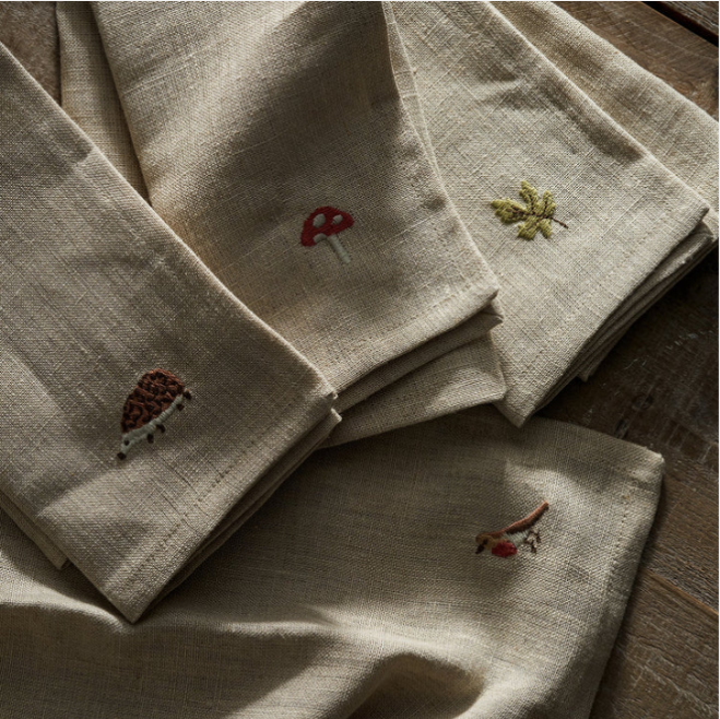 Add a touch of woodland charm to your dining table with these linen napkins that feature beautifully detailed embroidery, including a leaf, toadstool, hedgehog and robin. The timeless yet playful design creates a charming look for any tablescape, perfect for everyday use or as a stylish addition to a more formal table setting. The neutral colourway pairs excellently with Sophie's other designs, so you can mix and match your style effortlessly.